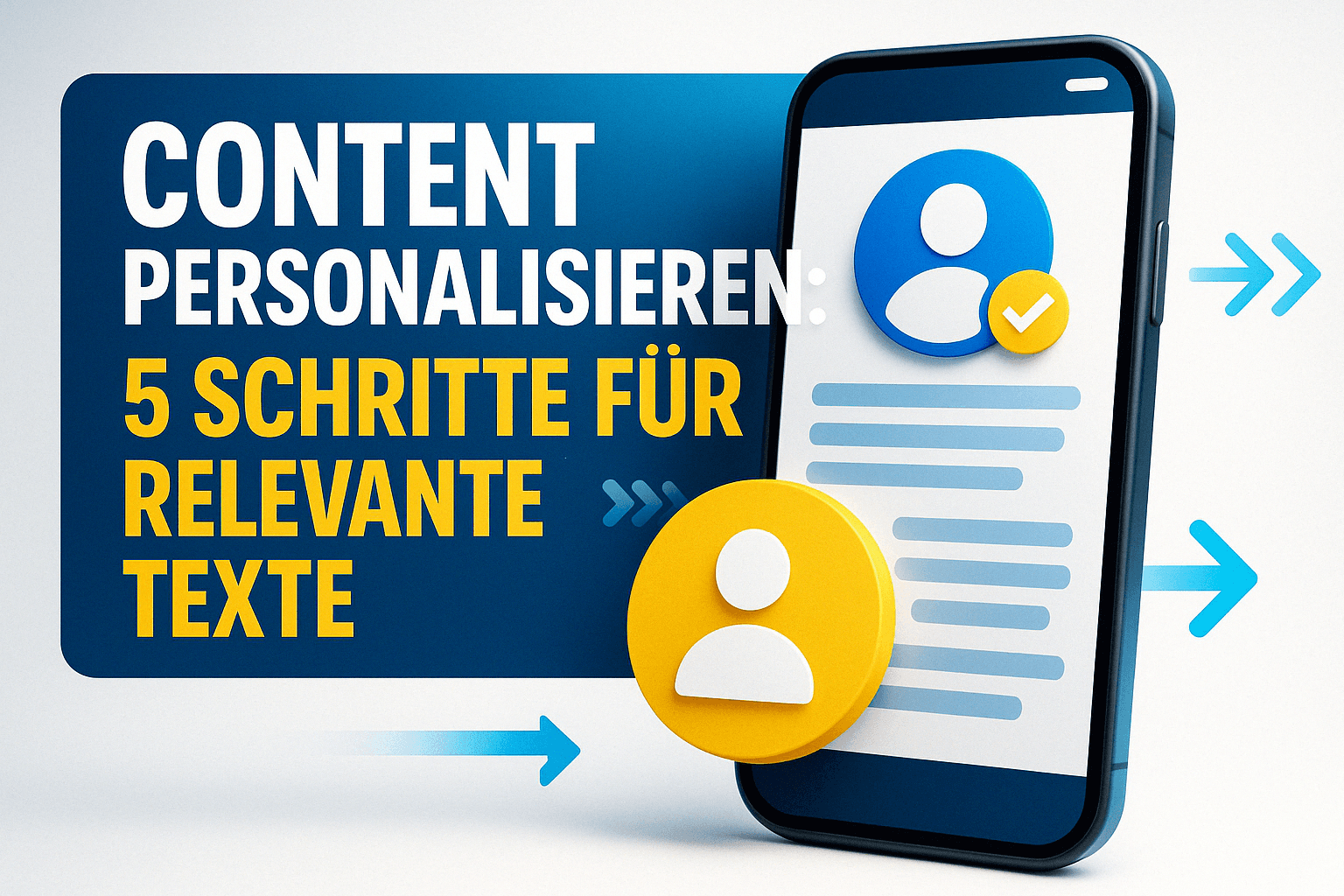 Moderne Grafik mit Smartphone, Nutzer-Icons und Text zur Headline „Content personalisieren: 5 Schritte für relevante Texte“ auf blauem Hintergrund.