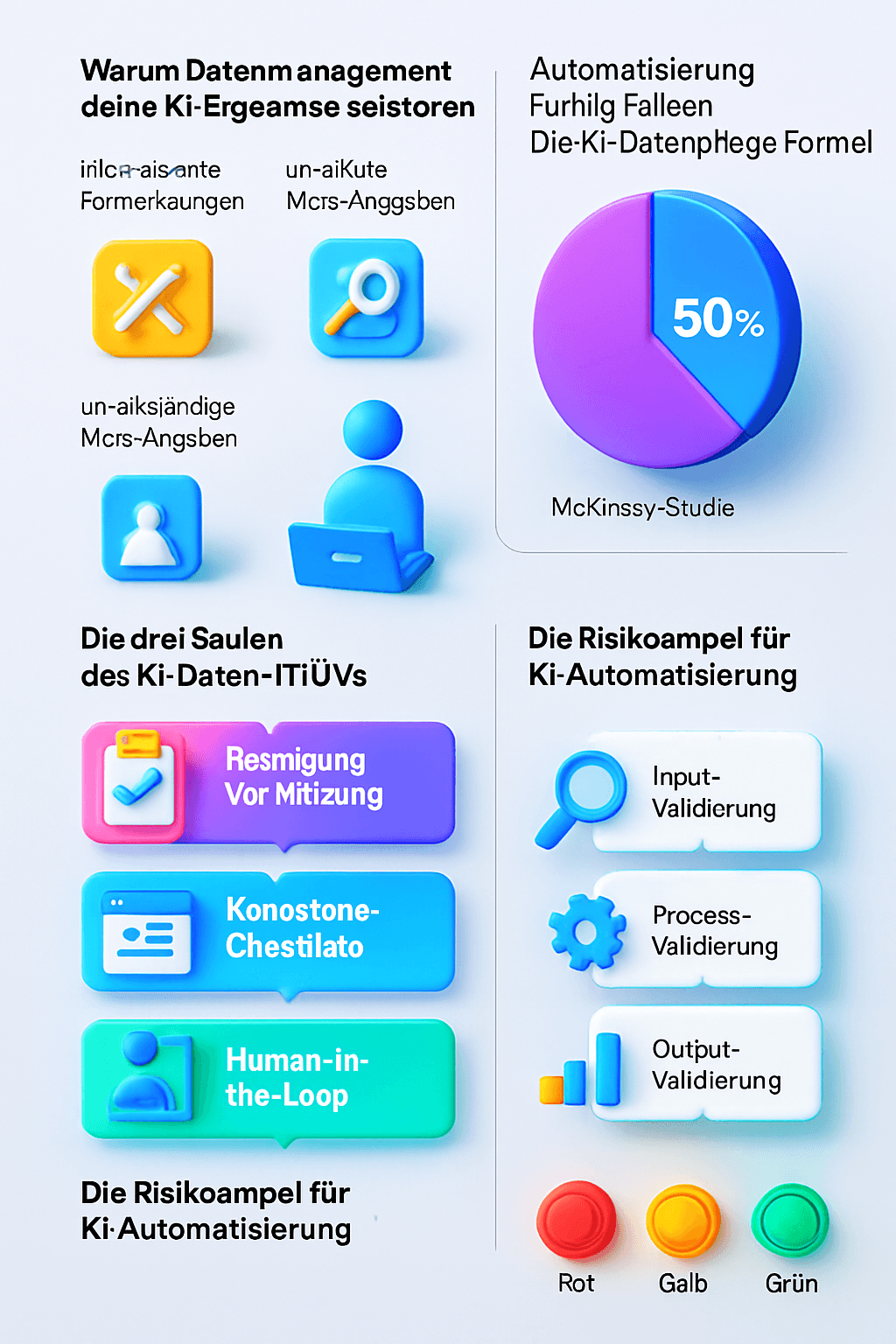 Fehlerhafte Datensätze verwandeln KI-Tools in Hochgeschwindigkeits-Irrtumsmaschinen. Eine McKinsey-Studie zur KI-Akzeptanz belegt: 50% der Mitarbeiter zweifeln an KI-Genauigkeit – meist wegen schlechter Datenqualität. Hier liegt der Teufel im Detail: Inkonsistente Formatierungen, veraltete Keywords und unvollständige Meta-Angaben verzerren jede KI-Analyse für die Automatisierung von SEO-Prozessen.
