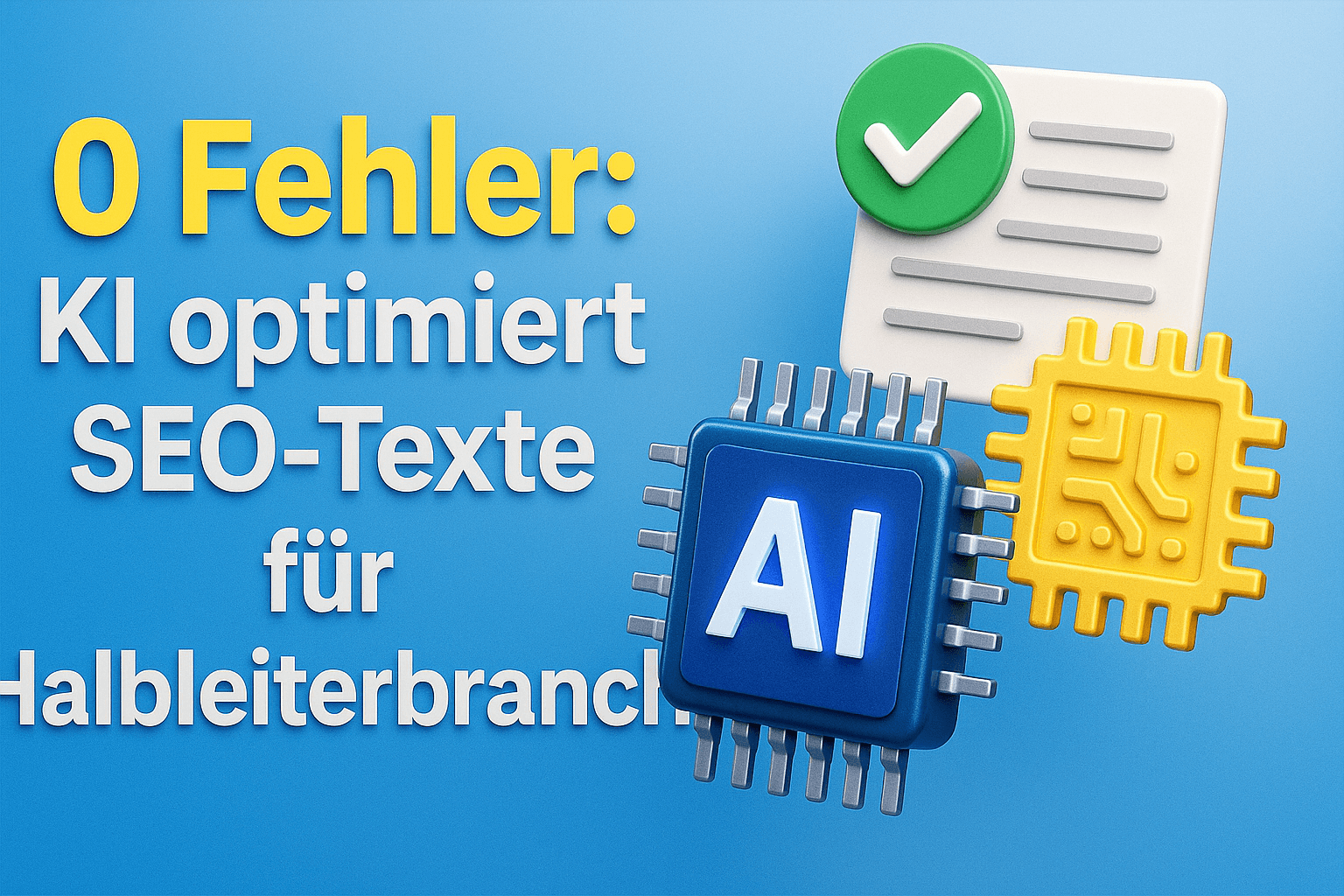 3D-Werbegrafik mit KI-Chip, Häkchen-Dokument und Halbleiter-Symbol – visualisiert fehlerfreie SEO-Textoptimierung durch Künstliche Intelligenz in der Halbleiterbranche.