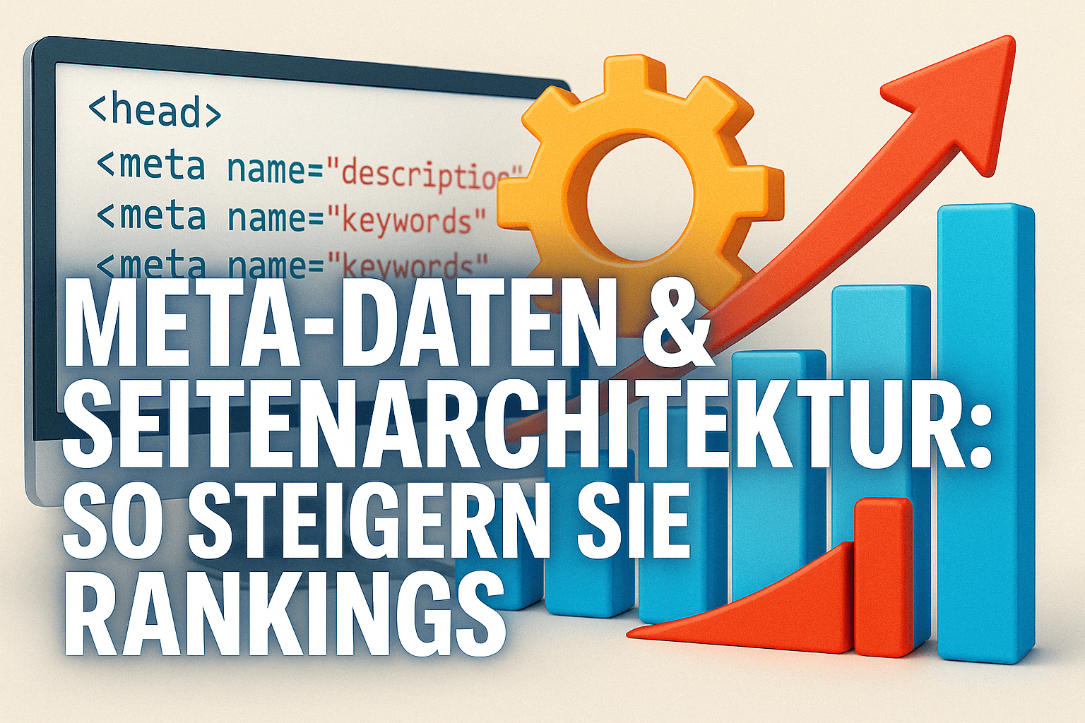 Helles, hyperrealistisches SEO-Thumbnail mit HTML-Code, Zahnradsymbol, Balkendiagramm und Titel „Meta-Daten & Seitenarchitektur: So steigern Sie Rankings“ – ideal für technische SEO-Optimierung.