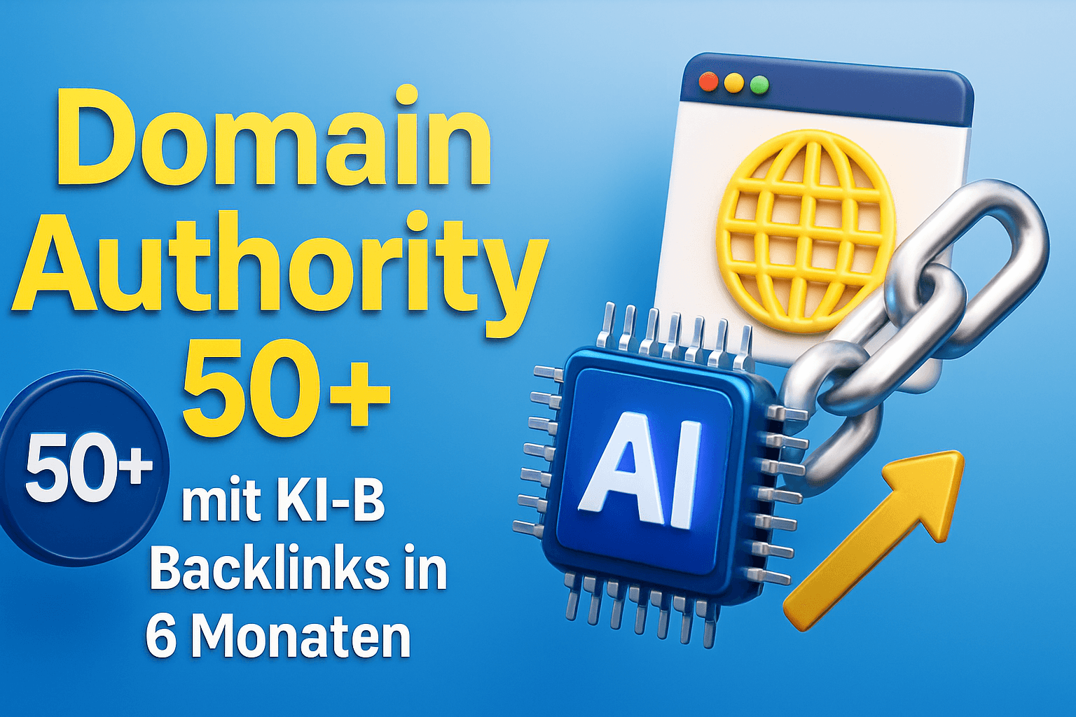 3D-Werbegrafik mit KI-Chip, Browserfenster, Kettenlink und Aufwärtspfeil – visualisiert den Aufbau von Domain Authority 50+ durch KI-generierte Backlinks in nur 6 Monaten.