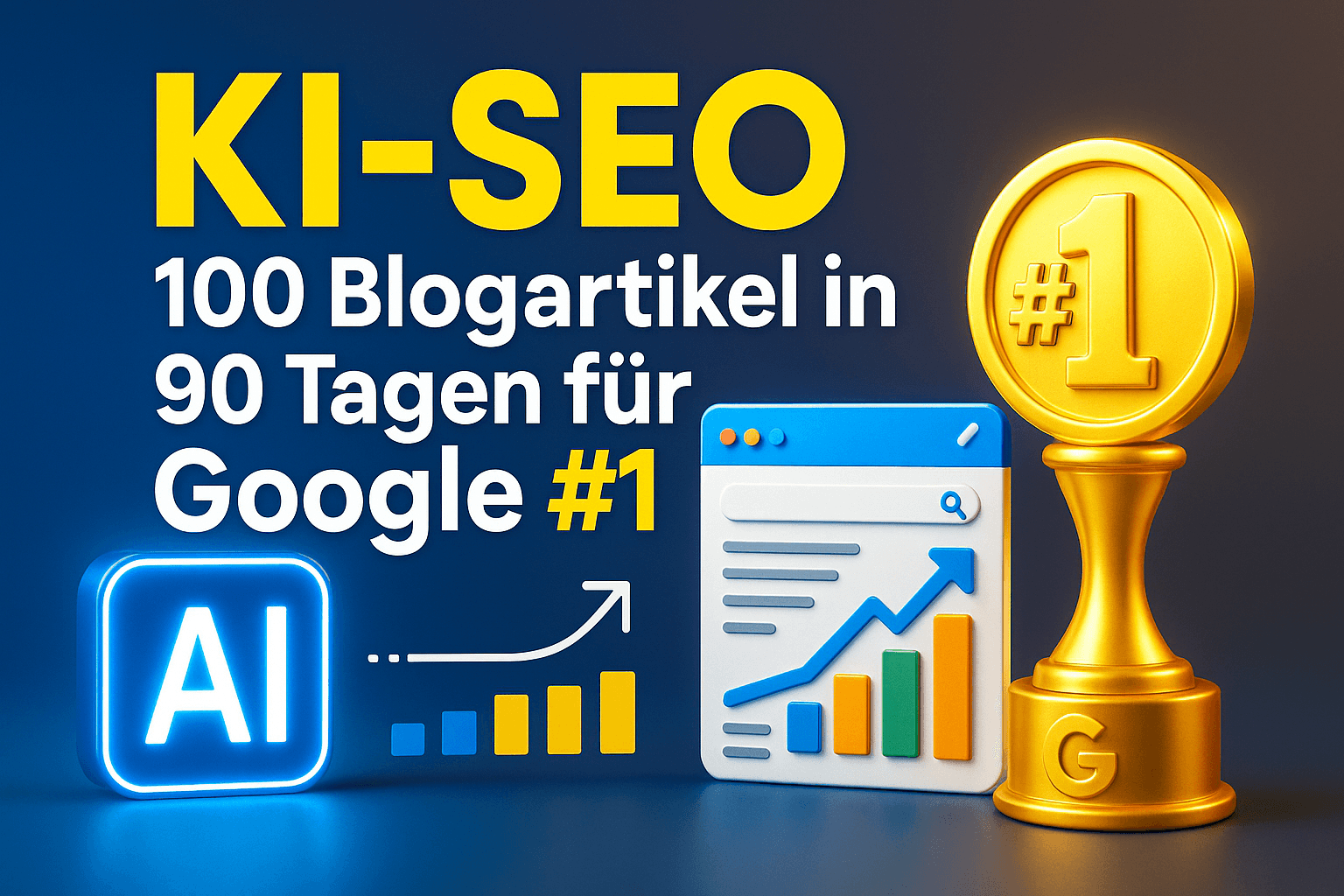 Werbung für KI-SEO: 100 Blogartikel in 90 Tagen, mit Symbolen für Künstliche Intelligenz, Webanalyse und Google-Top-Platzierung