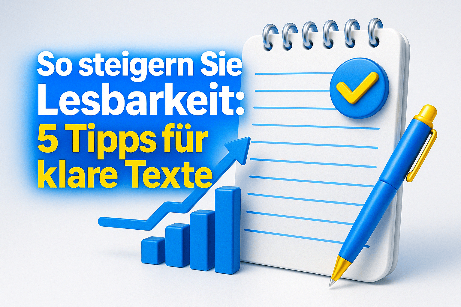 Hochwertige Grafik zur Verbesserung der Lesbarkeit mit Notizblock, Stift, Check-Symbol und Text „So steigern Sie Lesbarkeit: 5 Tipps für klare Texte“ in kräftigen Farben.